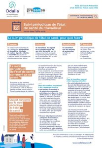 Le suivi consiste en des examens médicaux réalisés par un médecin du travail ou des visites par un infirmier en santé au travail à périodicité fixée par le Code du Travail ou adaptée par le médecin du travail en fonction des risques, de l’âge, ou des situations (handicap, grossesse …).